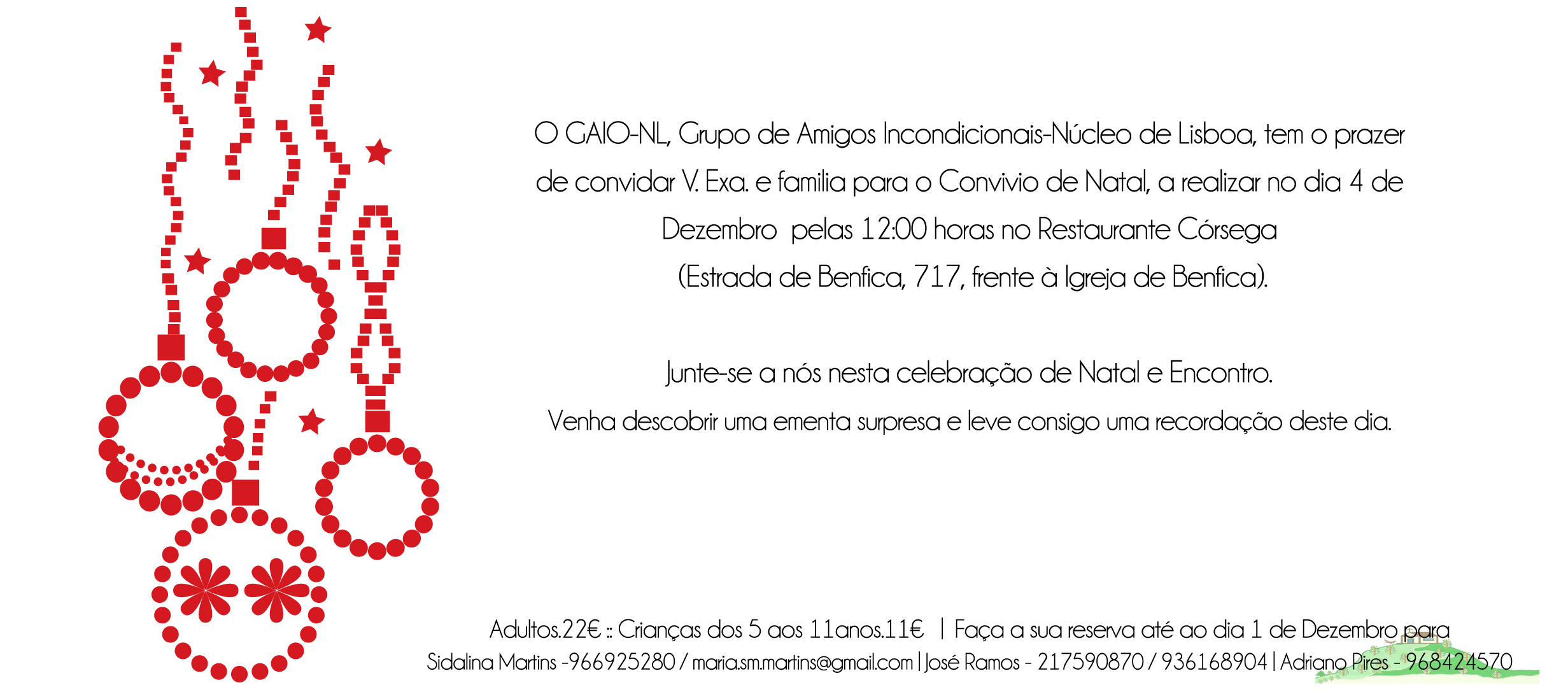 O GAIO-NL, Grupo de Amigos Incondicionais Núcleo de Lisboa vai realizar o seu Convívio de Natal no próximo dia 4 de Dezembro. Oportunidade para que os Orvalhenses possam confraternizar nesta época natalícia que se aproxima.