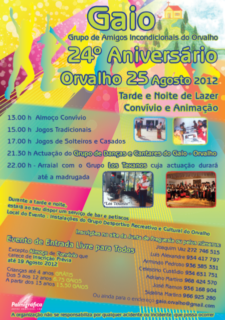 O GAIO, no desempenho do papel social, enquanto Associação Regionalista e no prosseguimento dos seus objectivos, vem convidá-los a participarem no convívio Anual entre Orvalhenses e Amigos da Freguesia de Orvalho, que terá lugar no dia 30 de Outubro de 2011 nas Instalações do Grupo Desportivo Recreativo E Cultural de Orvalho). Assim, O GAIO apela á participação de todos e espera que seja uma festa agradável de salutar convívio entre todos.