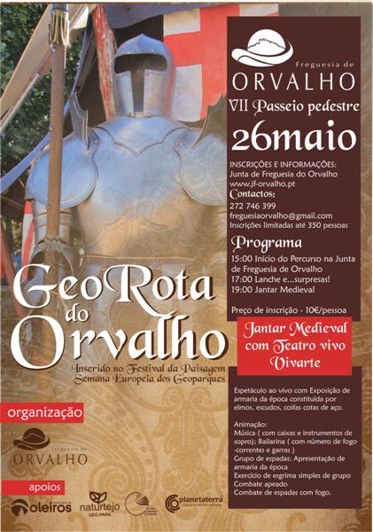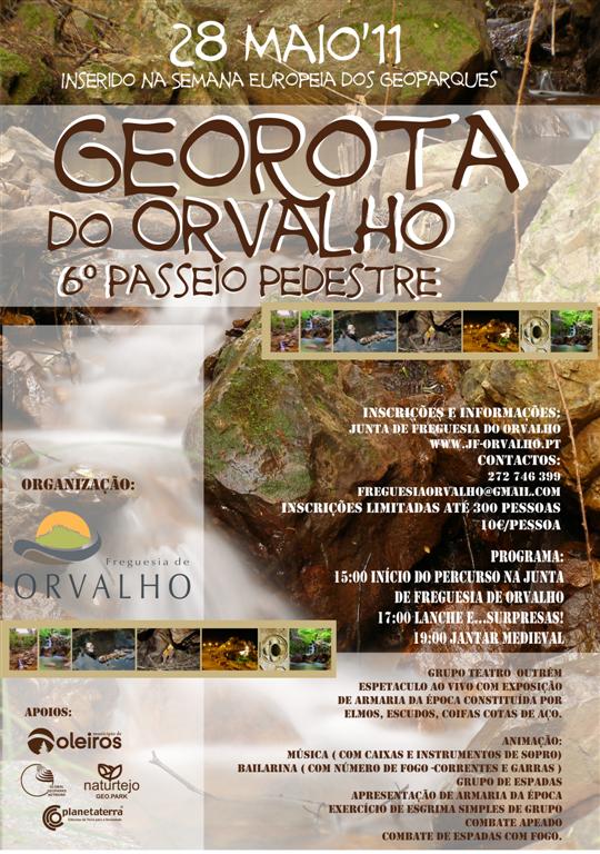 Pelo 5º ano a Freguesia de Orvalho vai realizar o Passeio Pedestre Geo Rota de Orvalho, inserido na Semana Europeia dos Geoparques. Este é já uma referencia no Pedestrismo em Portugal. Com 670 participantes no 4º ano depressa a beleza e fama deste percurso se espalhou, sendo muitas as pessoas que o percorrem.